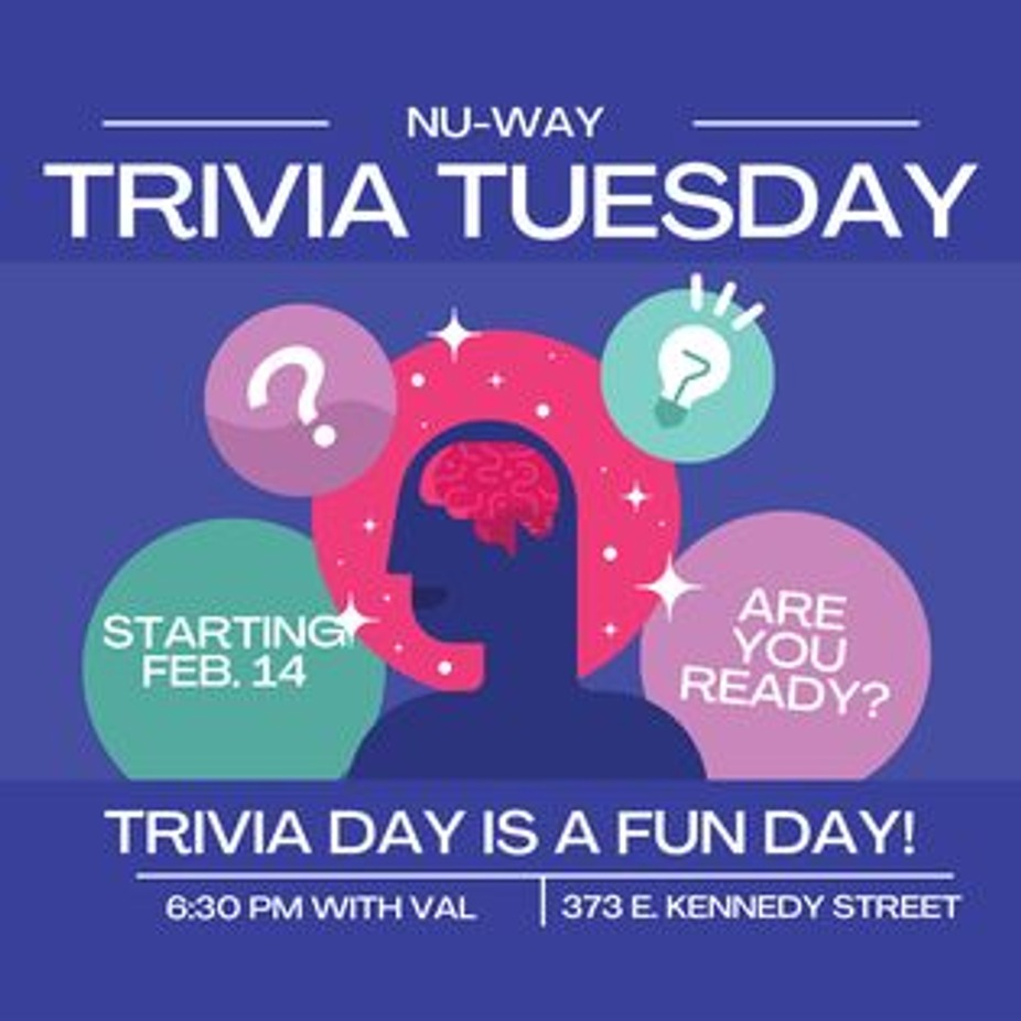 2026-01-13 18:30:002026-01-13 20:30:00America/New_YorkTuesday Trivia with ValEvery Tuesday at 6:30, Val tests your knowledge on anything and everything!! Smartest in the crowd wins a tab and bragging rights for the week!!Nu-Way Lounge & RestaurantNu-Way Lounge & Restaurant